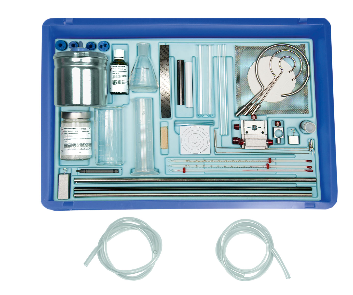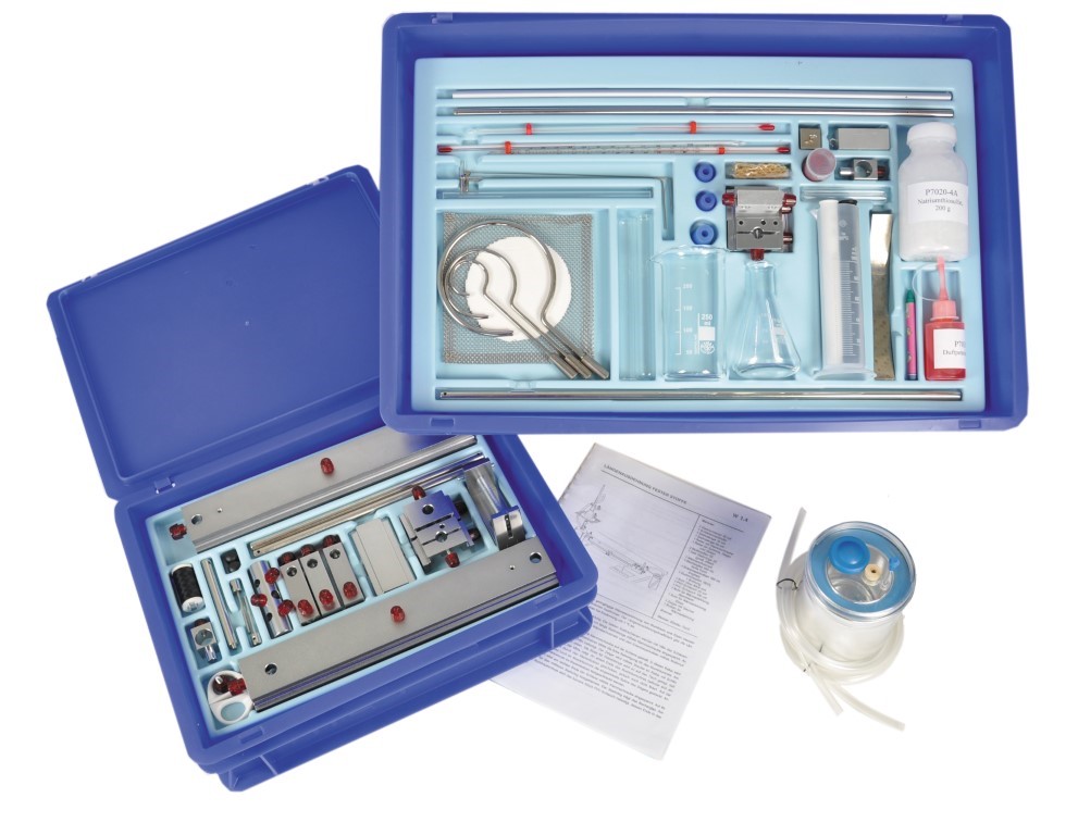 Setul conține în total 42 de piese, incluzând tuburi, instrumente de măsură, dopuri din silicon, blocuri metalice, recipiente din sticlă, accesorii pentru montaj, materiale pentru experimente termice și inserția din spumă pentru depozitare.